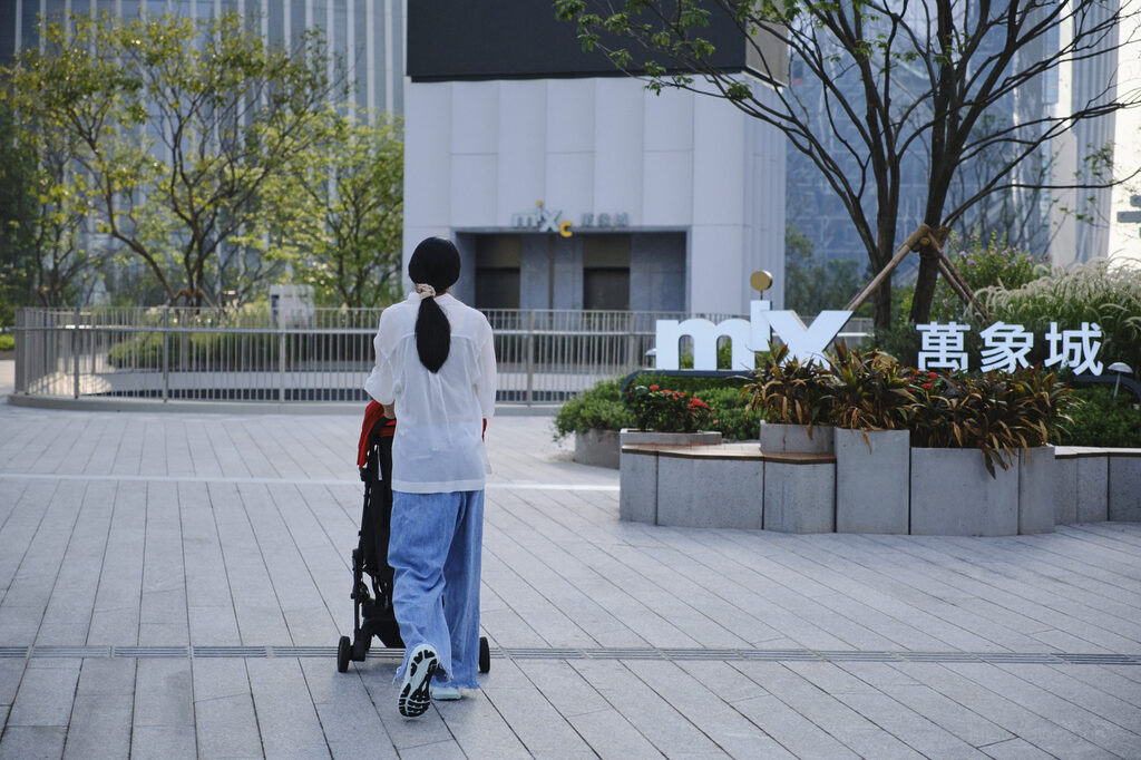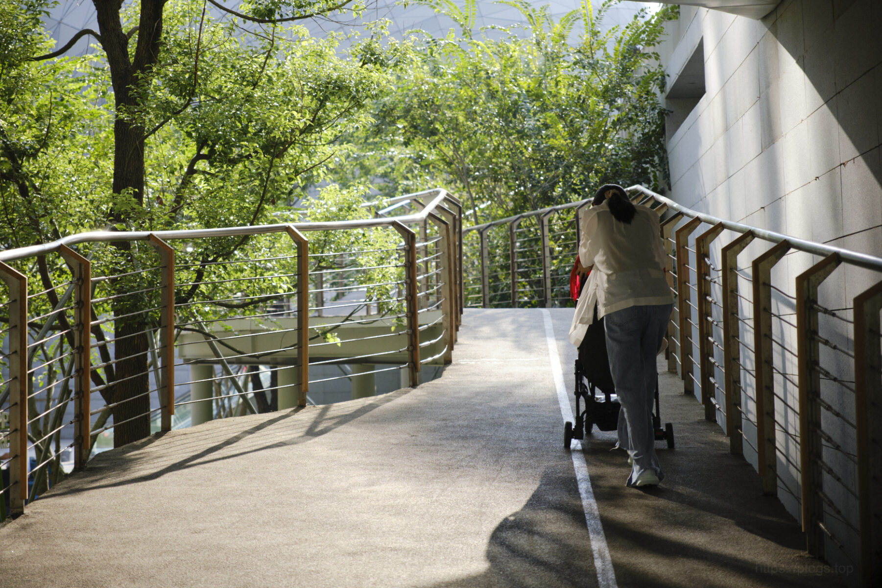 在一天早上,我推着小新新从海岸城的电梯上了通往万象城二期的连廊,偶遇了一个晨练的大哥。大哥也是自来熟,看到我这个奶爸推着推车溜娃,就主动过来和我说现在可以通过万象城二期的商场前往春笋和人才公园了!